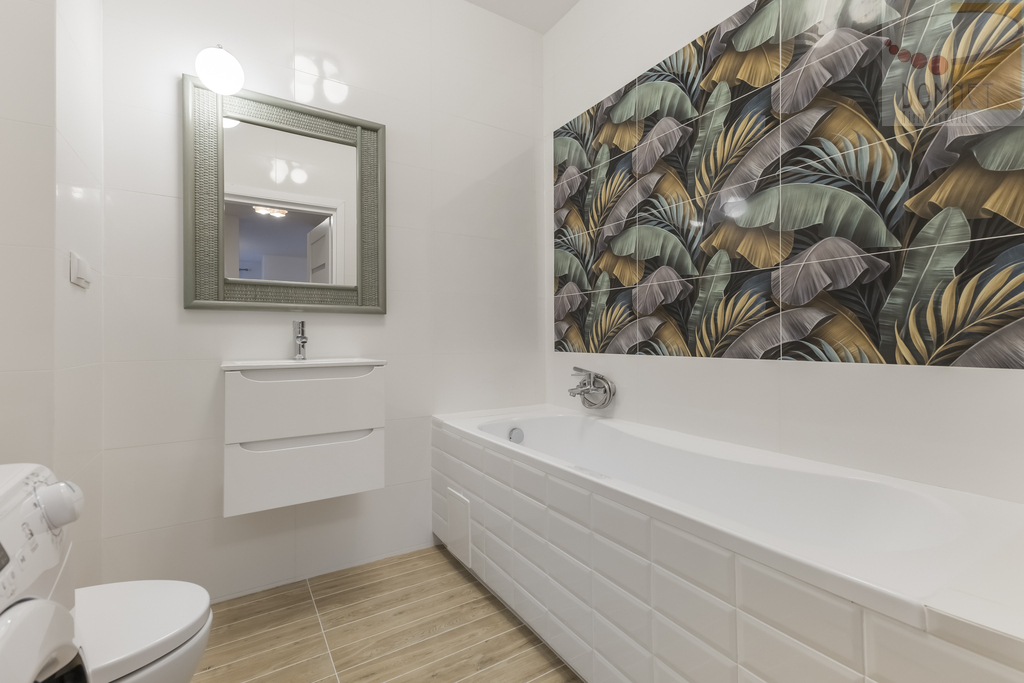 Łazienka wyposażona w wannę i pralkę