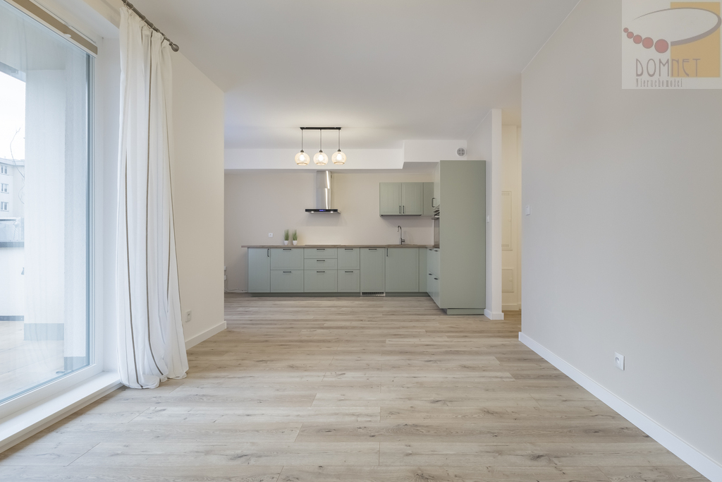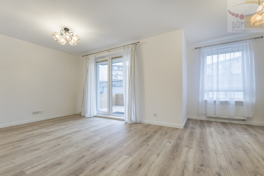 Układ przestronny salon (28 m2) z wyjściem na taras (16 m2) i ogródek (100 m2), w pełni wykończona kuchnia ze sprzętem AGD, łazienka z wanną i pralką, dwie sypialnie