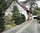 Ogrodzenie z cegły klinkierowej z metalowymi przęsłami. Wjazd i wejście do domu wyłożone kostką brukową.