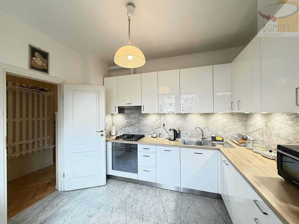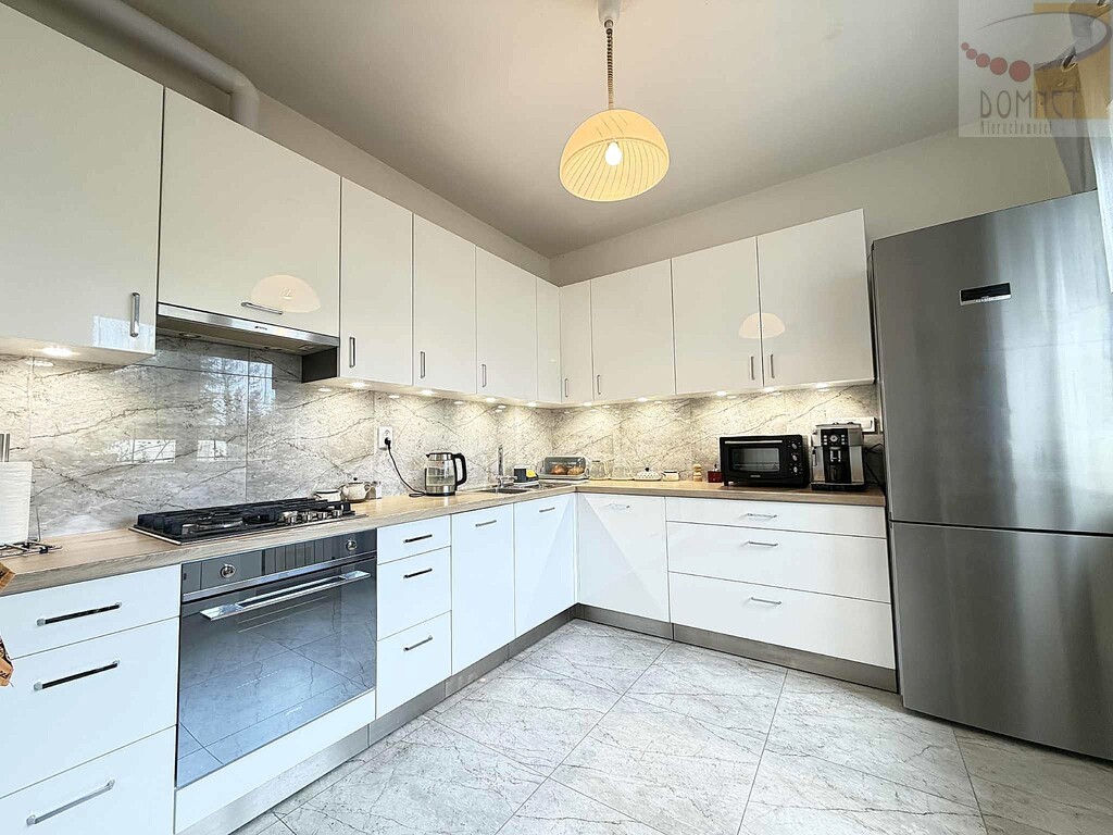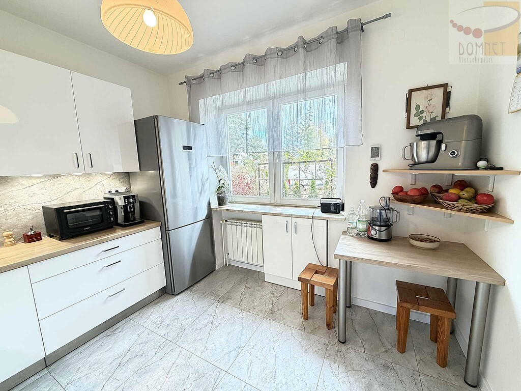 Budynek ocieplony styropianem 10 cm, tynki akrylowe, na cokole marmolit, wejście do domu i do piwnicy wyłożone płytkami klinkierowymi, okna i drzwi drewniane, na podłogach parkiet bukowy, w łazienkach i w kuchni gres, na tarasie gres, parapety marmurowe, nowe grzejniki aluminiowe, instalacja c.o miedziana, kuchnia i łazienka na parterze świeżo po remoncie.