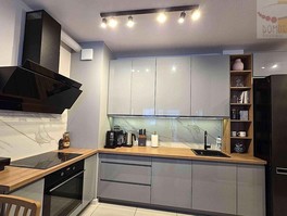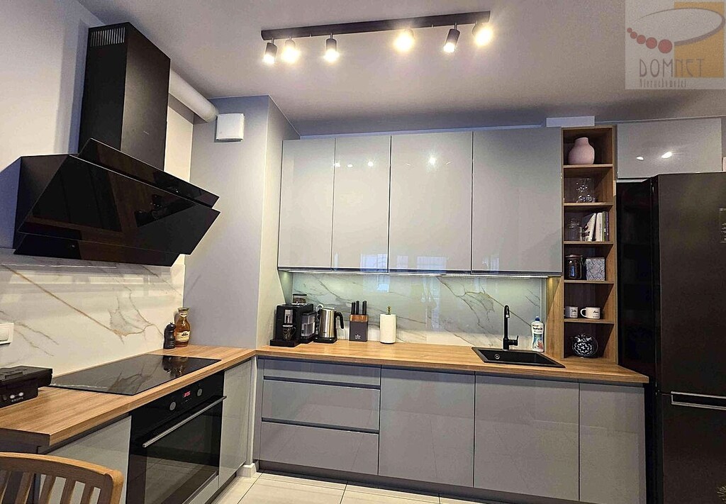 Kuchnia została wykonana na wymiar, wyposażona w sprzęt AGD. Meble kuchenne posiadają lakierowane fronty w połysku.