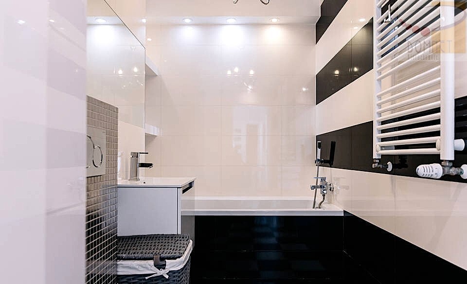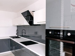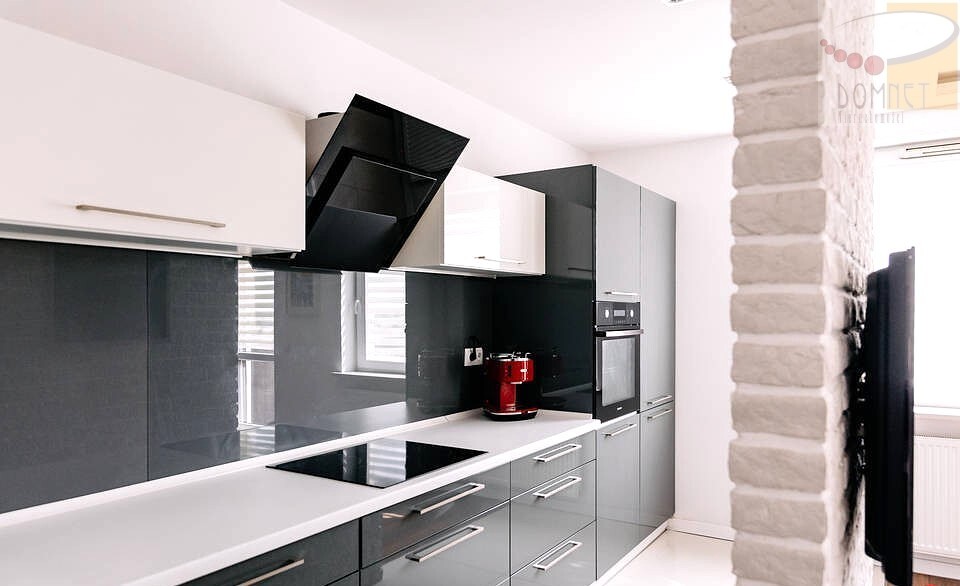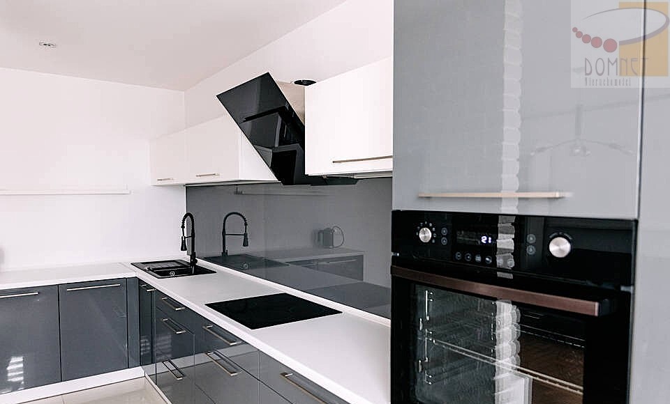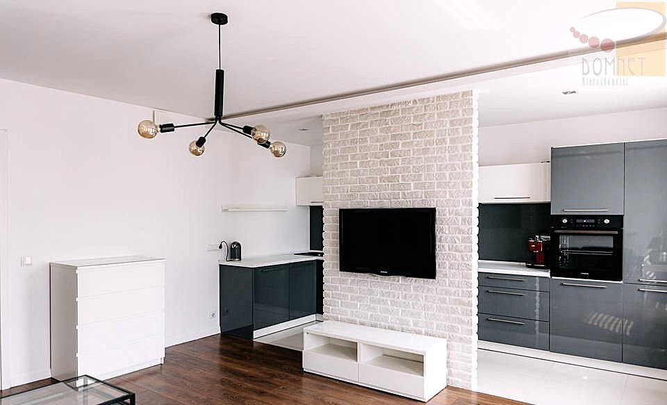 Kuchnia wykonana na wymiar, w pełni wyposażona w sprzęt AGD, które pozostaje w cenie mieszkania. Dodatkowym atutem jest klimatyzacja.