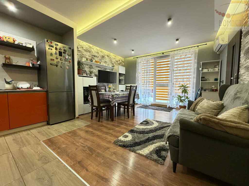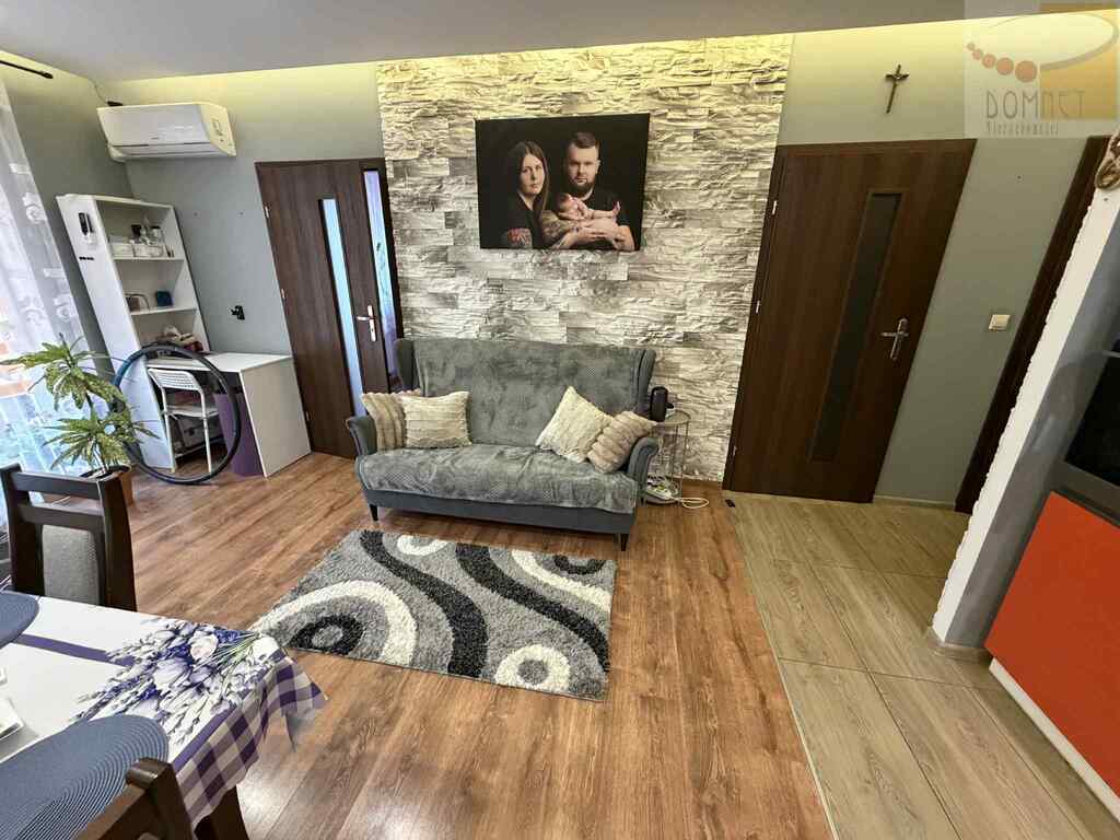 Układ Salon z aneksem kuchennym, obecnie wydzielony dodatkowy pokój dla dziecka (płyta G-K - można łatwo wrócić do dużej sypialni) oraz przytulna strefa sypialniana.