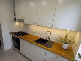 W cenie meble oraz wysokiej klasy AGD (zmywarka, pralko-suszarka, lodówka, piekarnik).