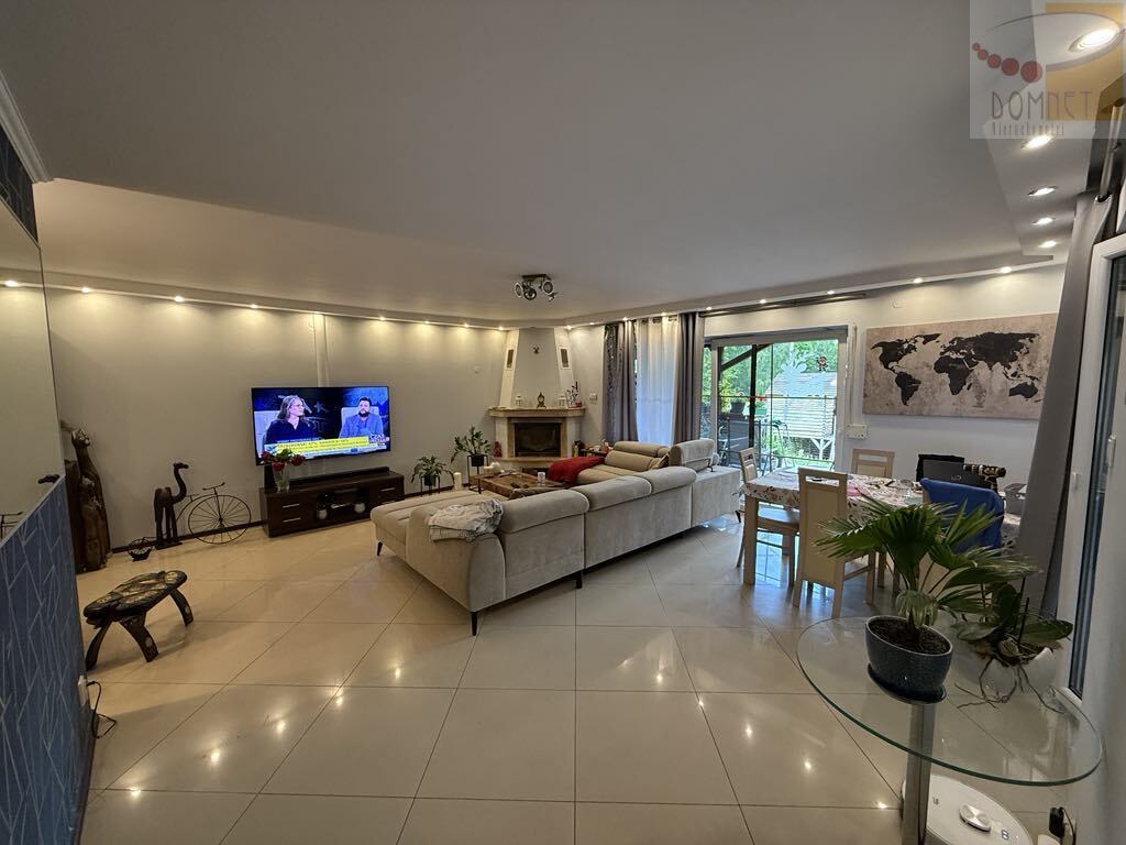 - 35m2 salon z wyjściem na taras 14m2 z betonowym grillem i zajściem schodami do ogrodu, gres, kominek