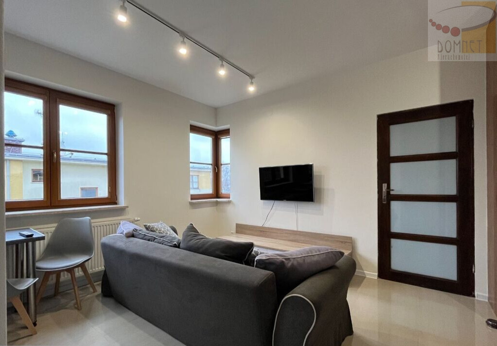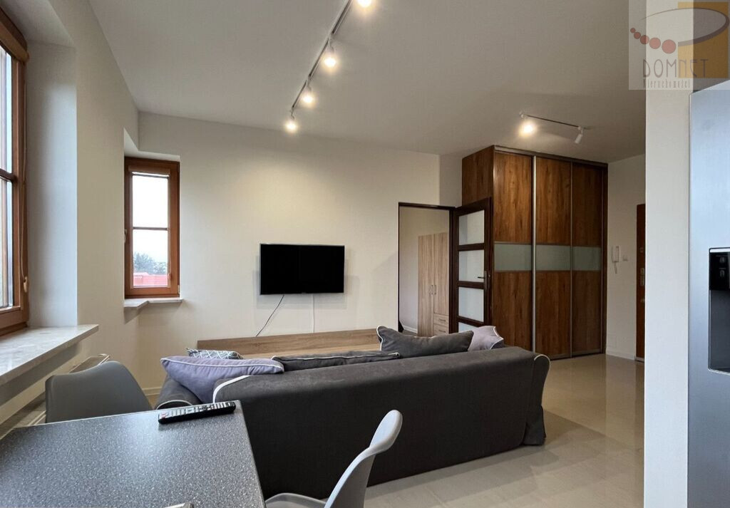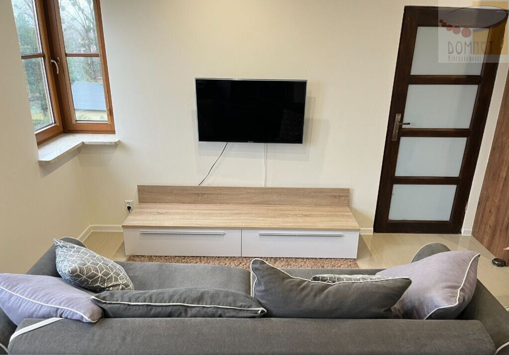 Centralnym punktem salonu jest wygodna kanapa, naprzeciwko której znajduje się telewizor.