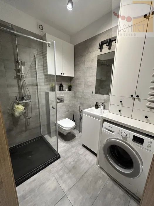Funkcjonalna łazienka z kabiną prysznicową i pralką, gotowa do codziennego użytku