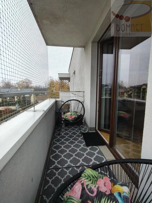 Balkon z miejscem na dwa fotele i stolik, wyposażony w siatkę zabezpieczającą dla zwierząt