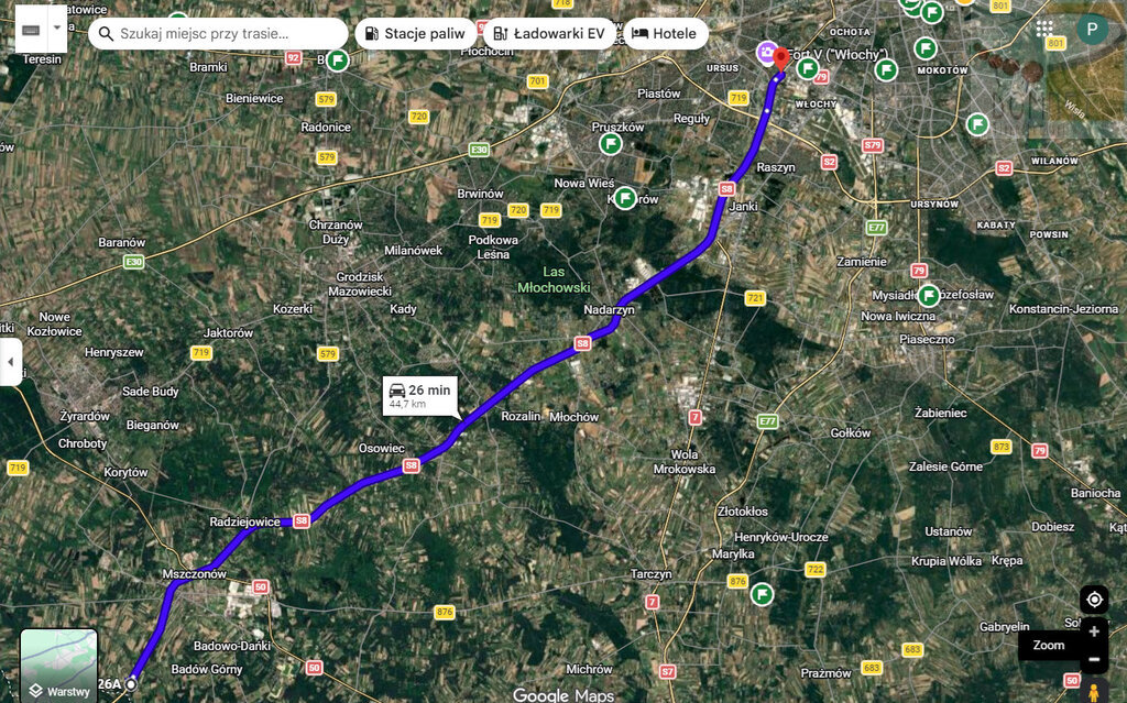 - 28 minut do węzła Łopuszańska (Warszawa) trasą S8.